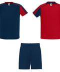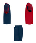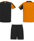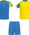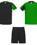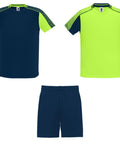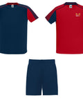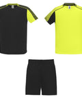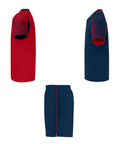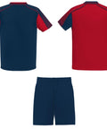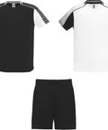 Komplekts sastāv no 2 t-krekliem un 1 pāra šortu. Otrā t-krekla krāsa ir izstrādāta pretēji pirmajam. Tehnisks un elpojošs audums. T-krekli ar daļēji raglan piedurknēm un apdruku. Apļveida kakla izgriezums ar trikotāžu aizmugurē. Elastīga jostasvieta šortos ar atbilstošu iekšējo aukliņu ar drošības šuvi. Šorti ar kontrastējošu sānu joslu un šķēlumiem apakšmalā. Noņemama etiķete. 100% poliesters, 140 g/m².